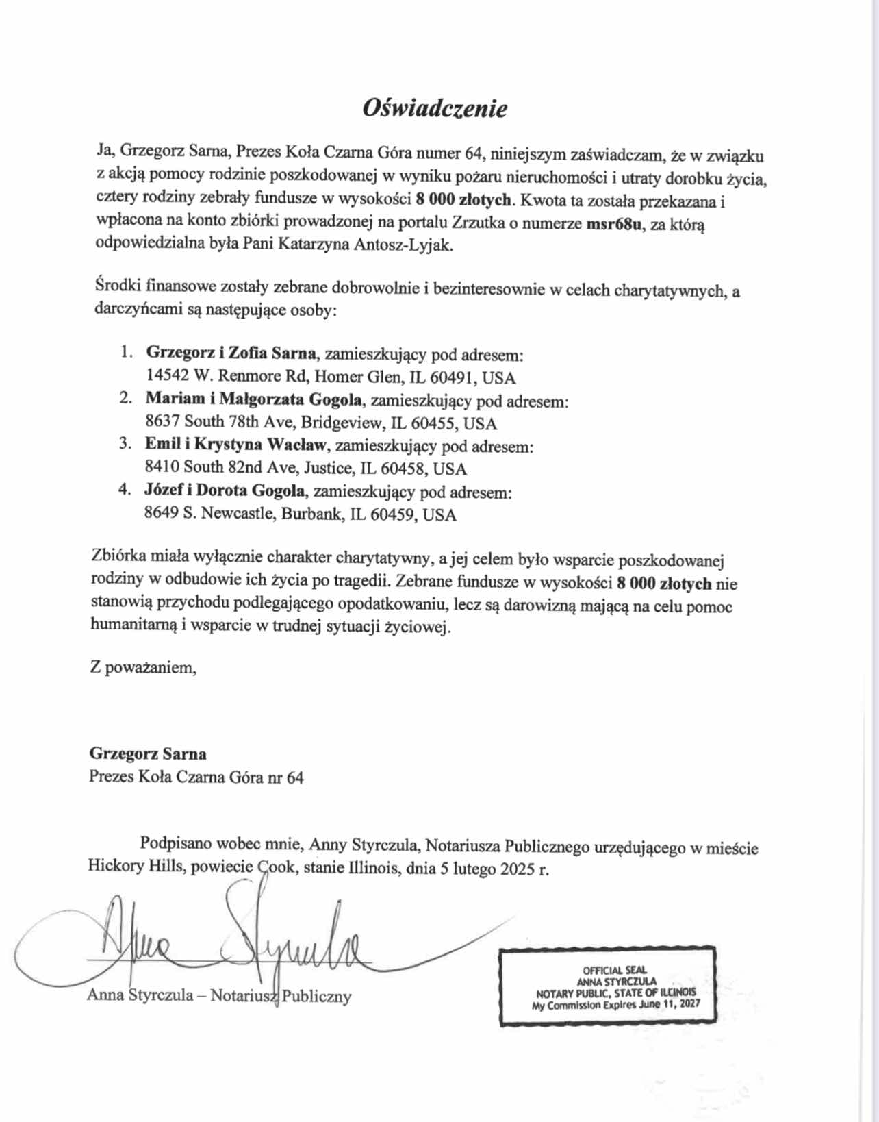 Koło 64 Czarna Góra – oświadczenie
